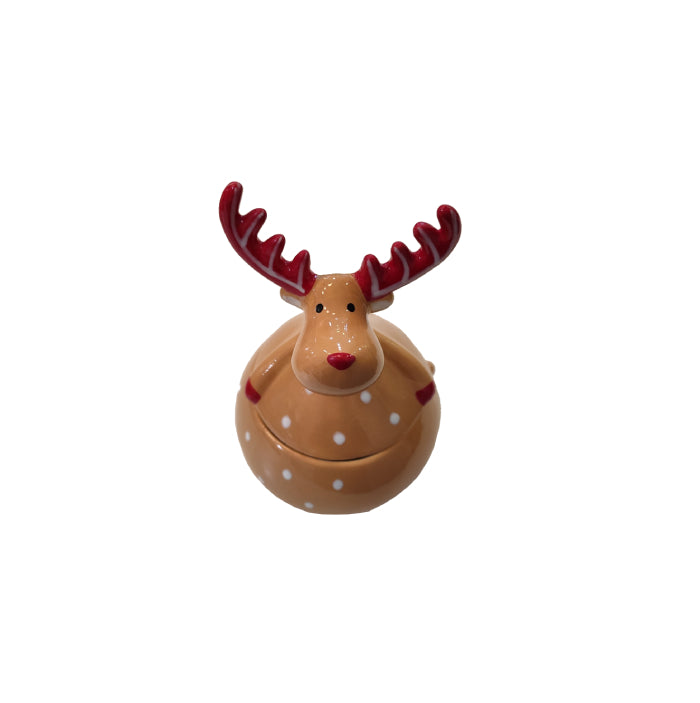 Charmoso pote em formato de rena, com detalhe do clássico nariz vermelho inspirado na história do Rudolf.