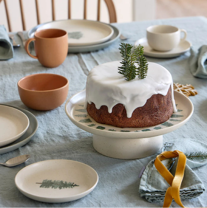 O Prato de Bolo com Pé Pacifica combina elegância e funcionalidade, sendo perfeito para apresentar bolos, sobremesas ou doces de forma sofisticada. Produzido em grés fino, possui desenhos delicados de pinheiros na base, adicionando um toque natural e festivo à mesa.