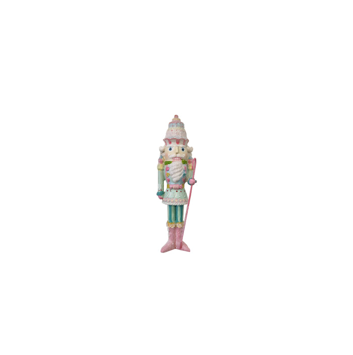 Figura decorativa inspirada no tradicional soldado quebra-nozes. Apresenta cores vibrantes em verde e rosa, com acabamento detalhado em poliresina que remete ao universo lúdico do Natal doce.