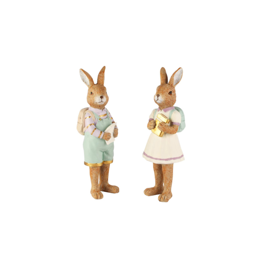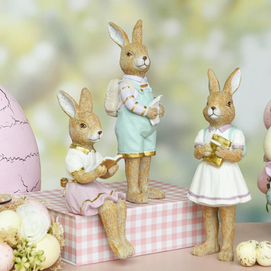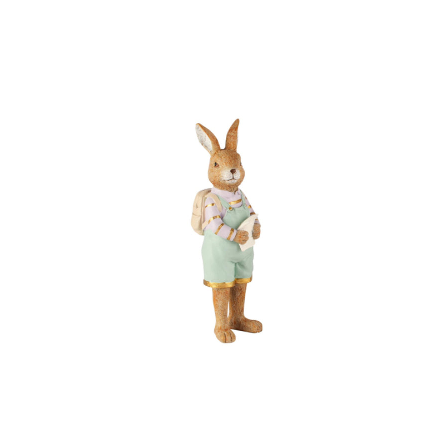 Figura decorativa de coelho em pé a segurar um livro, em delicados tons pastel, ideal para acrescentar um toque doce e encantador à decoração. O seu design detalhado e estilo suave tornam esta peça perfeita para ambientes temáticos, decoração de Páscoa ou espaços infantis.