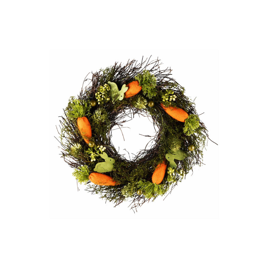 Grinalda decorativa com cenouras e coelhos, em tons de verde e laranja, ideal para criar uma atmosfera alegre e temática. O seu design divertido e primaveril torna esta peça perfeita para decoração de Páscoa ou para dar um toque criativo a qualquer espaço.