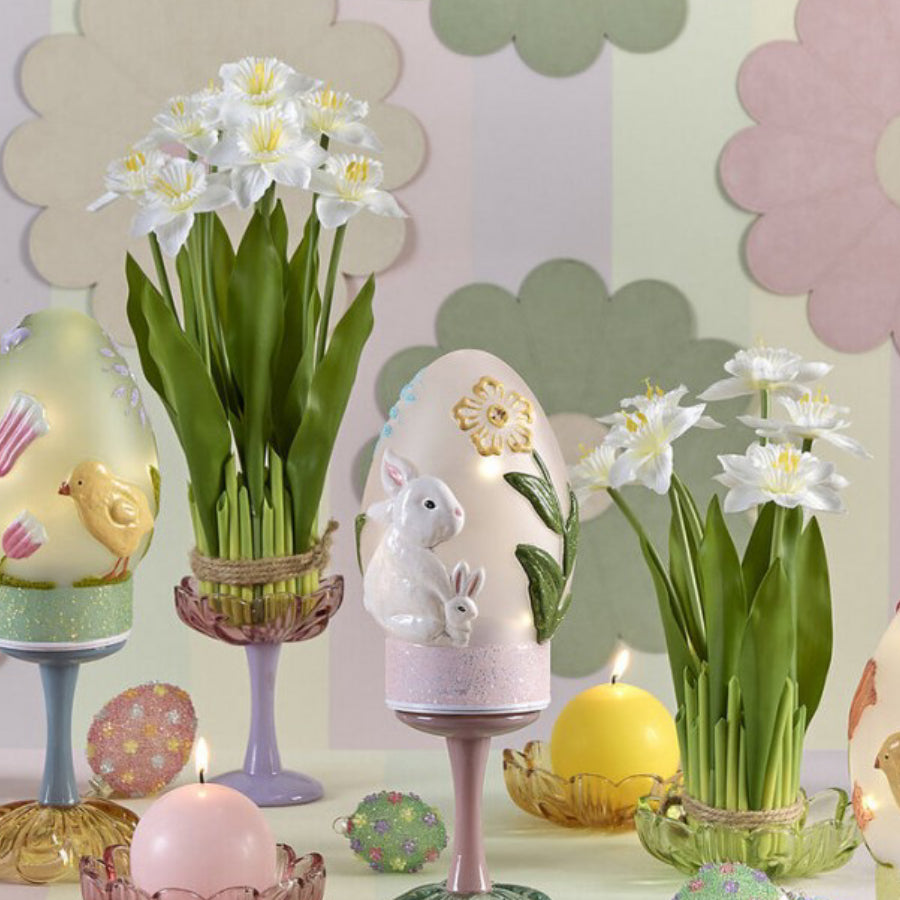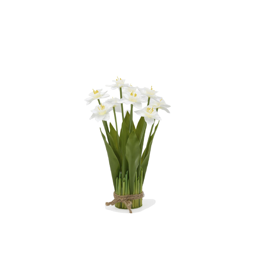 Ramo decorativo composto por nove flores de narcisos com folhas, ideal para acrescentar um toque fresco e primaveril à decoração. O seu design realista e acabamento cuidado tornam este ramo perfeito para arranjos duradouros, sem necessidade de manutenção.