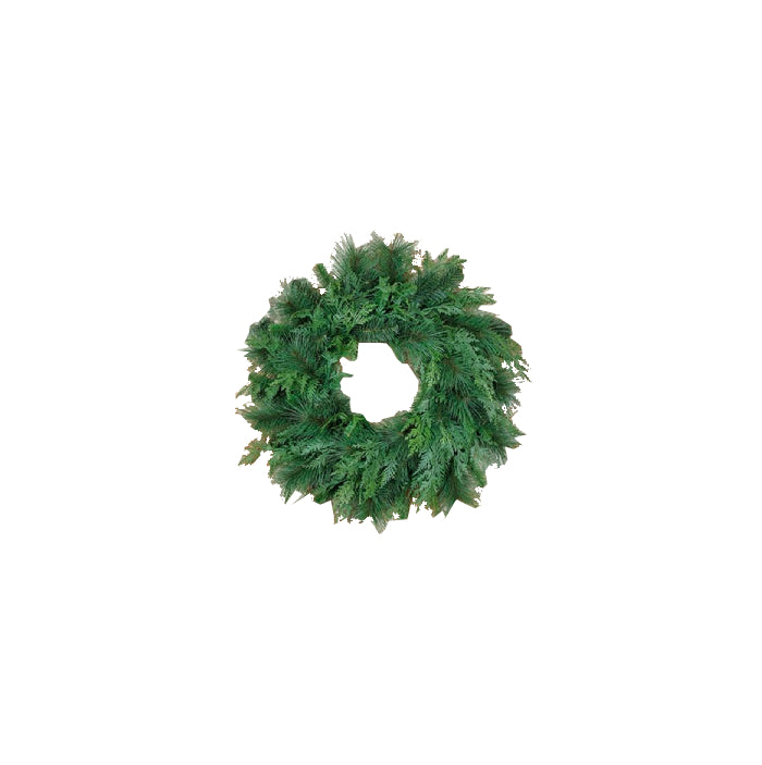 Coroa decorativa de pinheiro cipreste artificial, com efeito natural e acabamento detalhado que transmite a beleza do verde natalino. Com 50 cm de diâmetro, é uma peça versátil que pode ser usada tanto em interiores como exteriores cobertos.