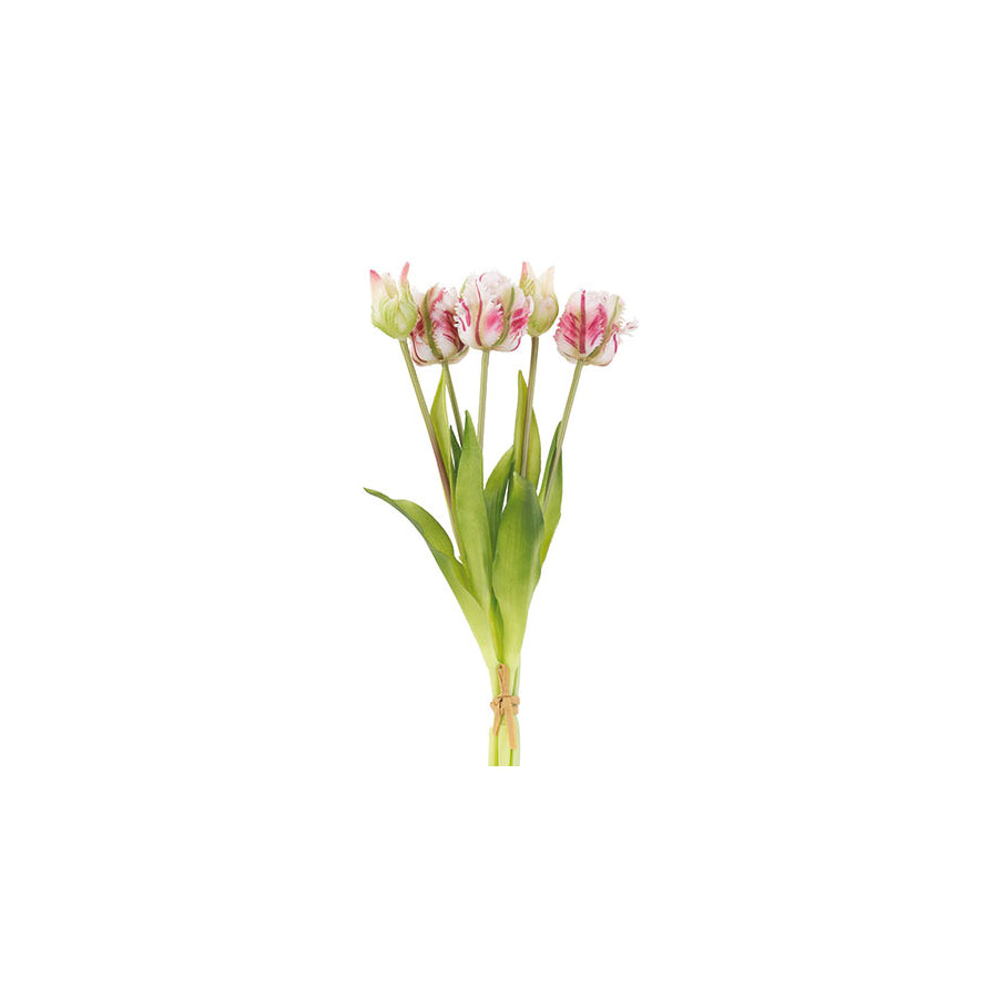 Conjunto de cinco tulipas artificiais em tom fúcsia, ideal para dar um toque vibrante e elegante à decoração. Com um aspeto natural e acabamento cuidado, estas flores são perfeitas para criar arranjos duradouros e sem necessidade de manutenção.