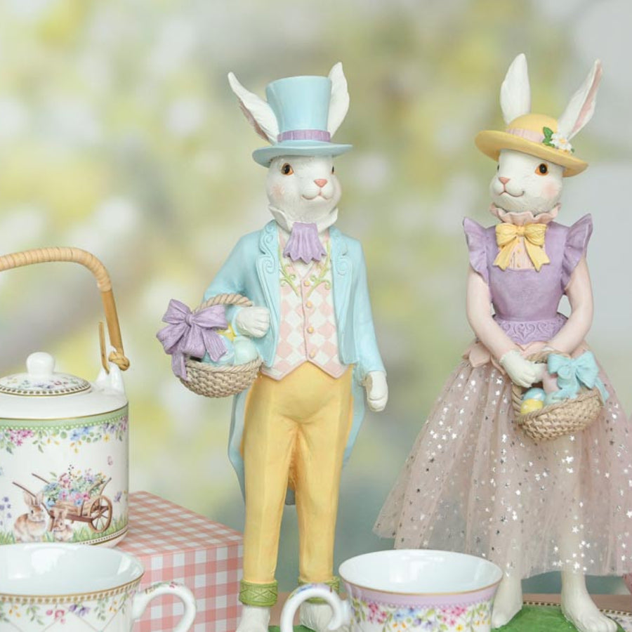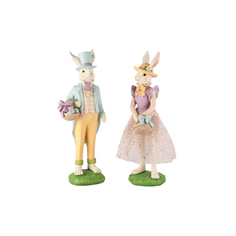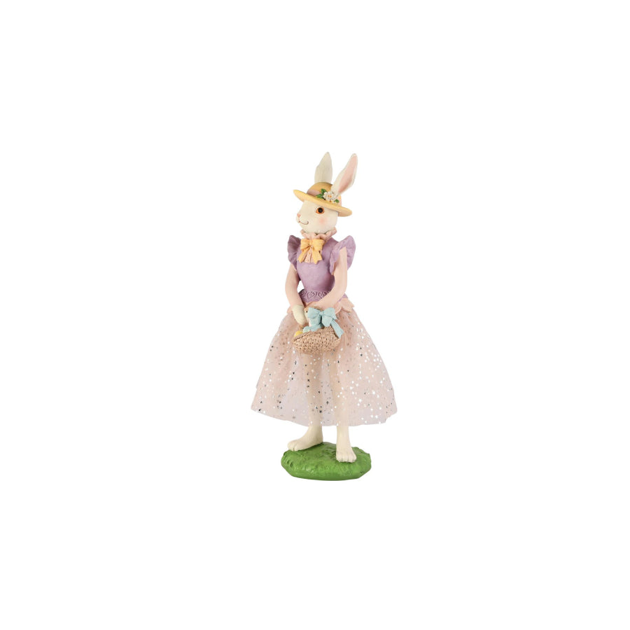 Figura decorativa de coelho em pé a segurar um cesto, em tons de rosa e azul, ideal para acrescentar um toque delicado e encantador à decoração. O design detalhado e o acabamento cuidadoso tornam esta peça perfeita para ambientes temáticos, decoração de Páscoa ou espaços infantis.