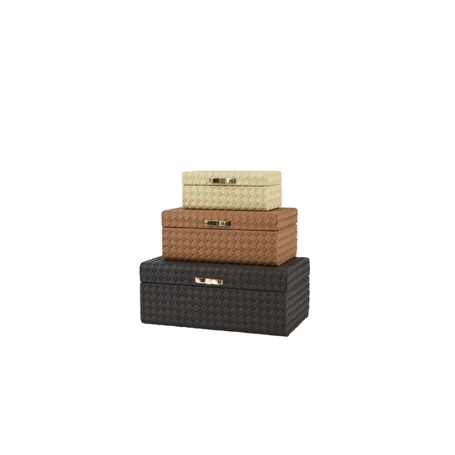 Descobre a beleza da simplicidade artesanal com este baú retangular em MDF, decorado com um delicado padrão entrançado e rematado por um fecho elegante em forma de laço de ferro.