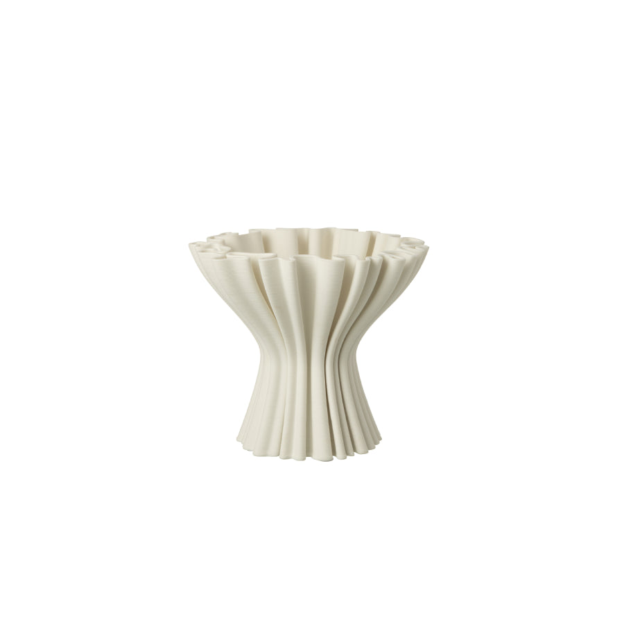 Uma peça que funde inovação e delicadeza. Com linhas irregulares inspiradas nas formas orgânicas da natureza, este vaso em porcelana branca é criado através de impressão 3D, revelando uma textura subtil e contemporânea que cativa ao primeiro olhar.