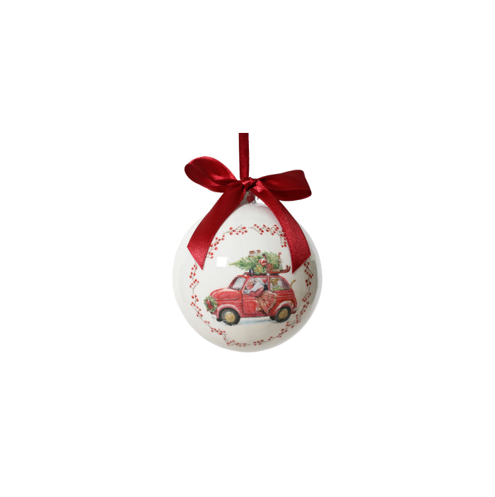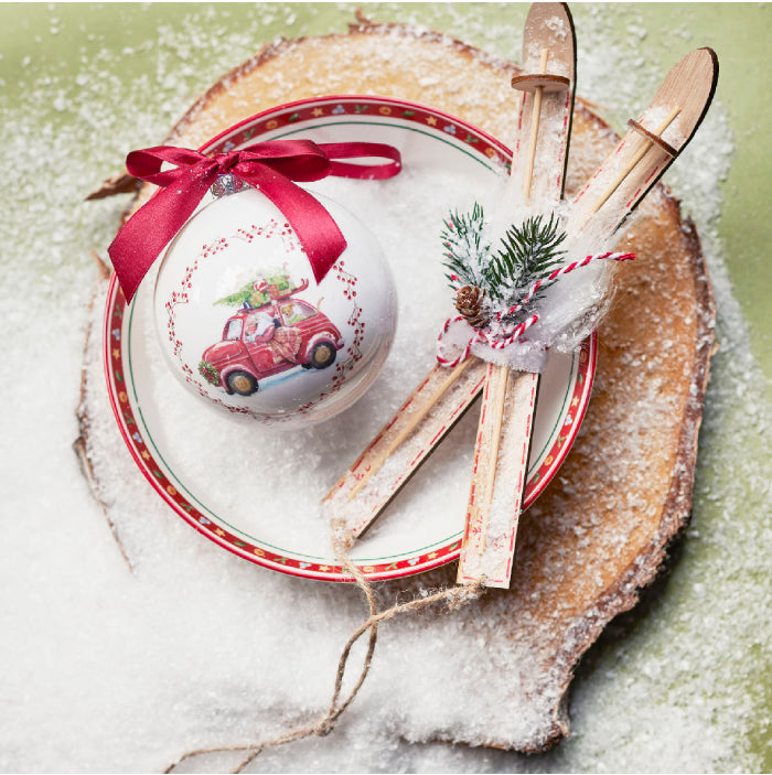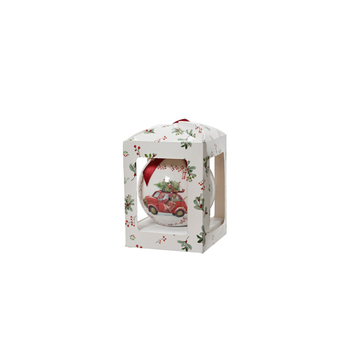 Um toque divertido e nostálgico para a sua árvore de Natal. Esta bola apresenta um delicado carro vermelho carregando ramos de azevinho, combinando charme, cor e espírito natalino. Ideal para composições lúdicas e temáticas, adicionando alegria e personalidade à decoração.