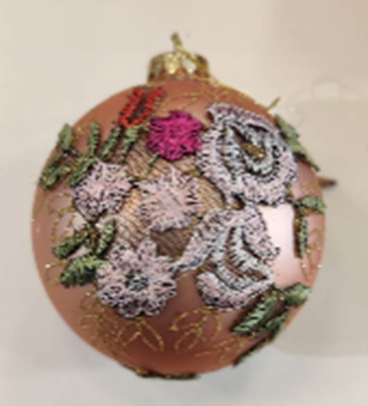 Um detalhe delicado que une romantismo e sofisticação. Esta bola de vidro em tom pêssego suave é enriquecida com bordados florais, que adicionam textura e refinamento à decoração natalina.
