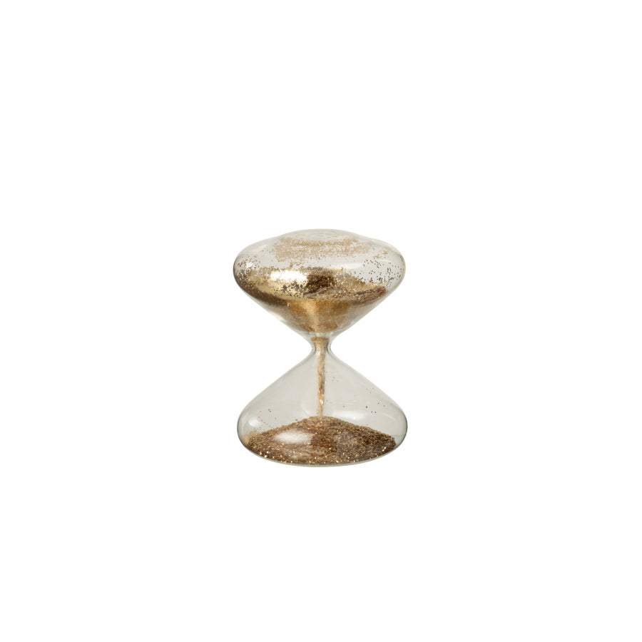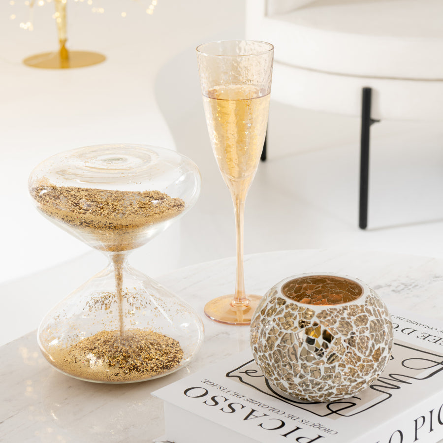 Celebra a arte da pausa com este elegante relógio de areia em vidro dourado, adornado com subtis brilhos que captam a luz e despertam os sentidos. Um símbolo do tempo que passa, mas também do momento presente, um convite à contemplação, à lentidão e ao equilíbrio.